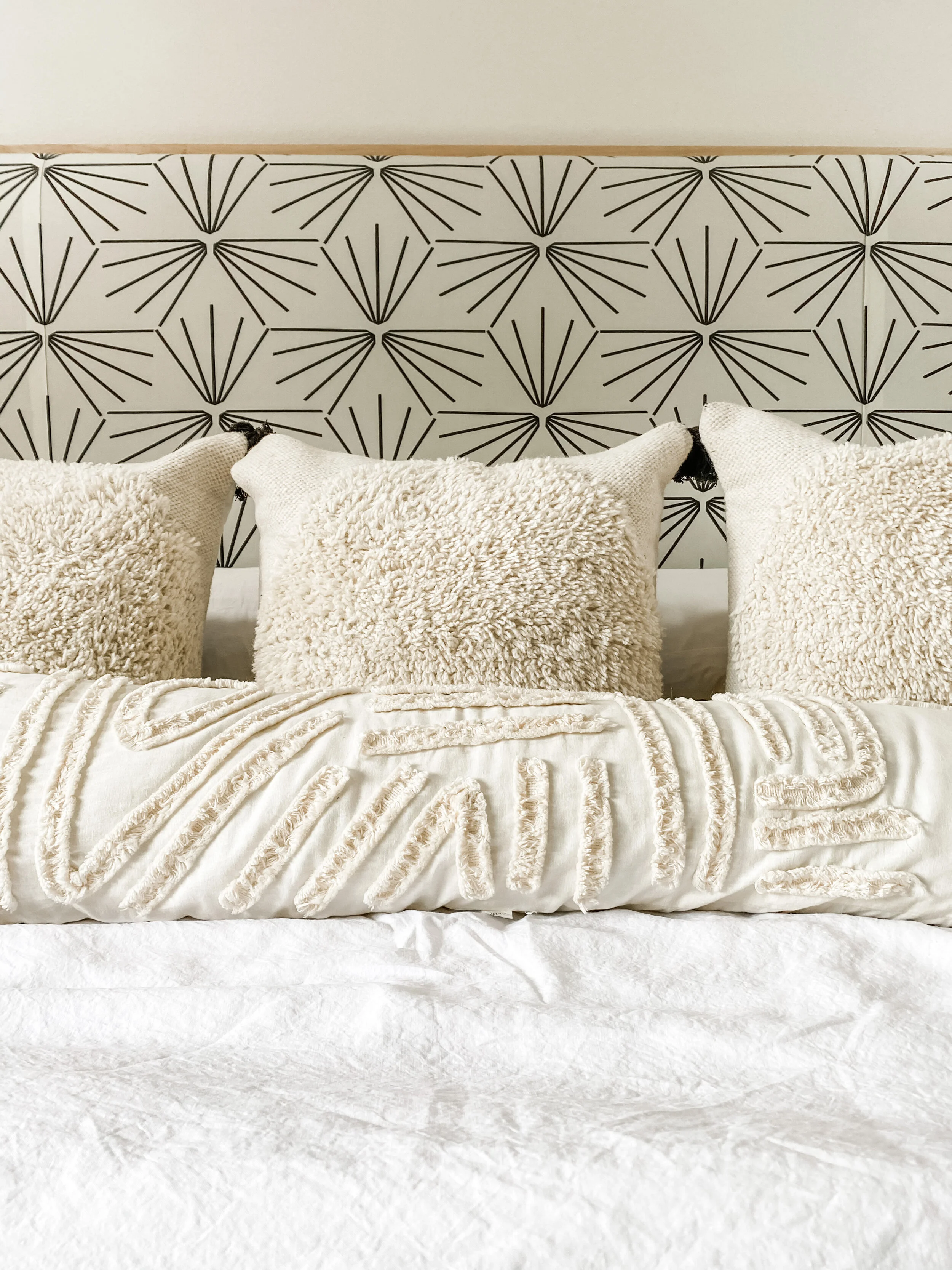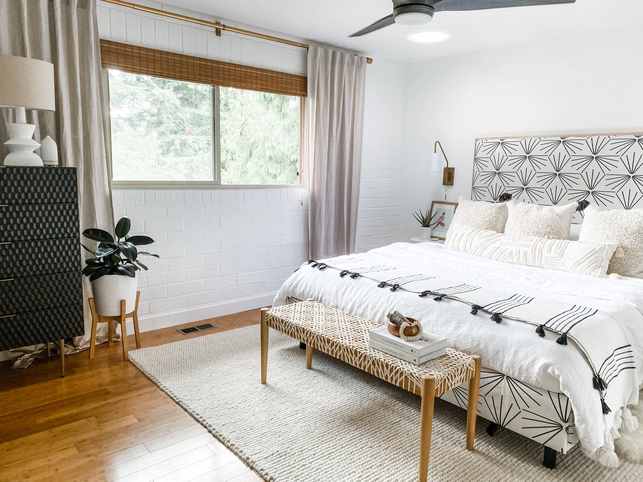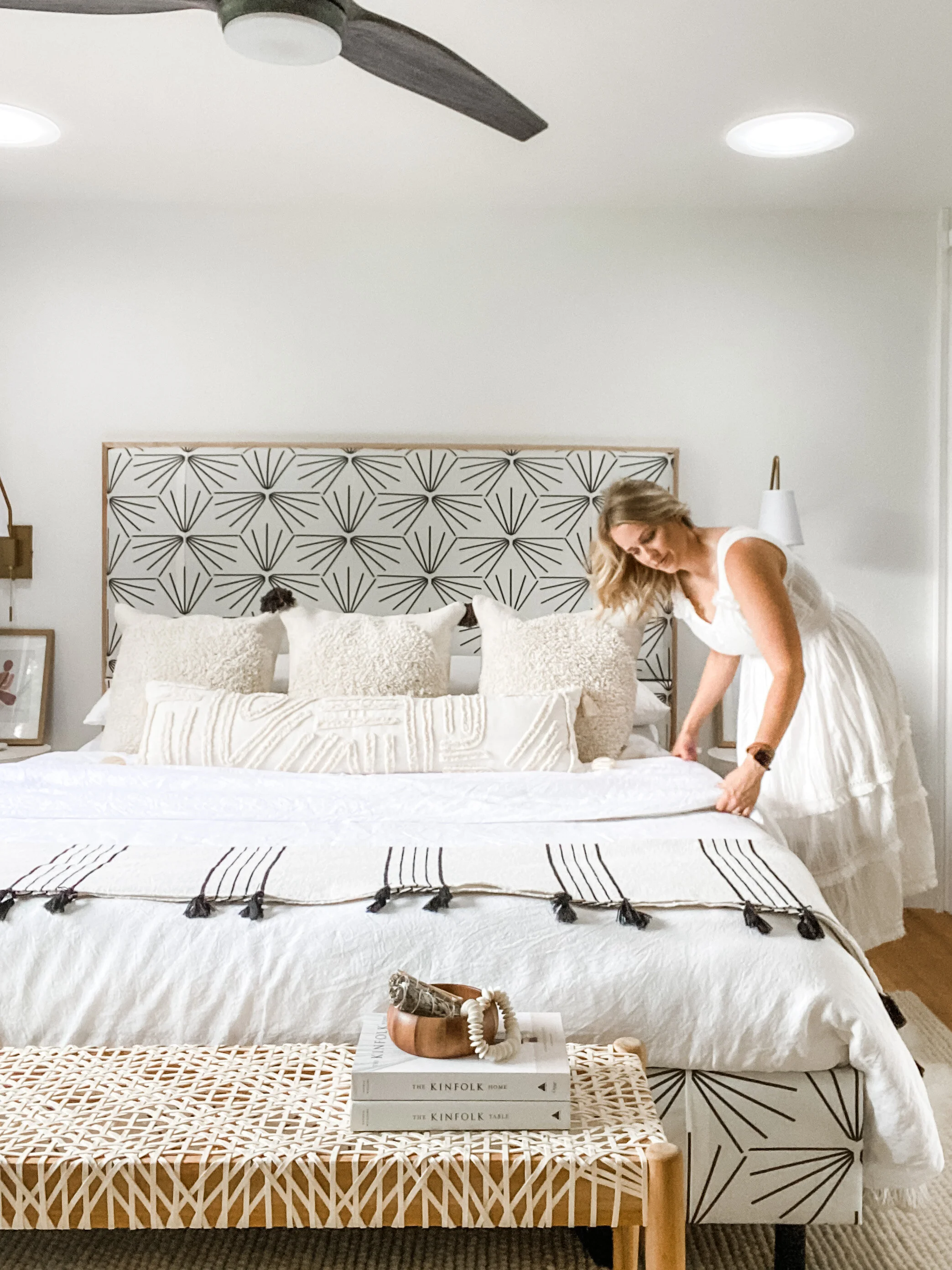 The other showstopper is undeniably the bed. I mean, what’s a bedroom without a bed? I absolutely love Holli Zollinger and this pattern, Sun Dial, was calling my name from the first day I started this project. I had used one of her graphic patterns on my last One Room Challenge and couldn’t have been happier with the wallpaper. But, I didn’t want to do just another bold wallpaper this time around, so I got ambitious, and reupholstered/made a bed finished entirely with this fabric. Coupled with really beautiful linens, an amazing mattress, and pillows I can’t get enough of, the bed feels so luxurious and comfortable - it’s honestly hard to get out of in the morning!