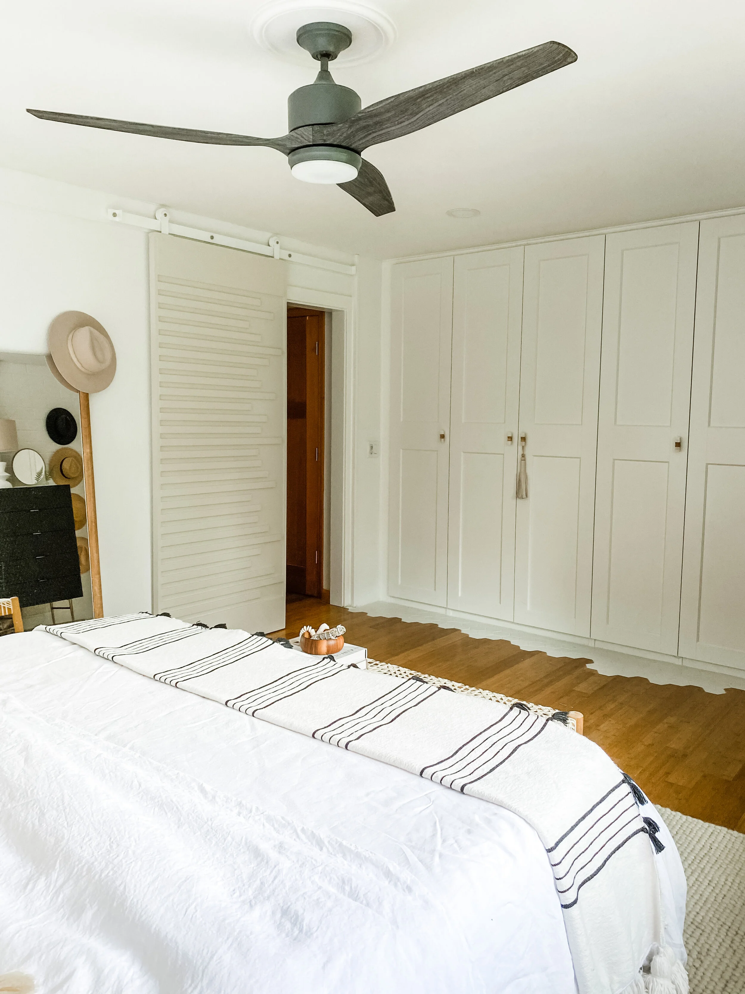 Paint does wonders. I painted the entire room (walls, trim, ceilings) all in Benjamin Moore’s Chantilly Lace. It was a lot of work, but I really feel like it made a massive difference. Also, adding two new can lights, two solar tubes, and LED lighting in the closet, really makes the space feel far brighter and more inviting. Scoring the white powder coated door hardware from Real Craft Hardware was huge too. I had major fears about having this massively invasive looking hardware in the room, but this hardware is truly top notch in terms quality, and the white fades right into the trim I had to install up there to accommodate the weight of the hardware in the doors. For those of you that have been following along, I ended up going back to Benjamin Moore’s Fog Mist for the handmade doors. Funny story - turns out I ended up buying a can of the BM Advance just “as is.” Zero color was added - haha, I’m still laughing hysterically over that faux pas. But, I think the color turned out to be really soft against all the white and ended up breaking up all the doors in the room now.