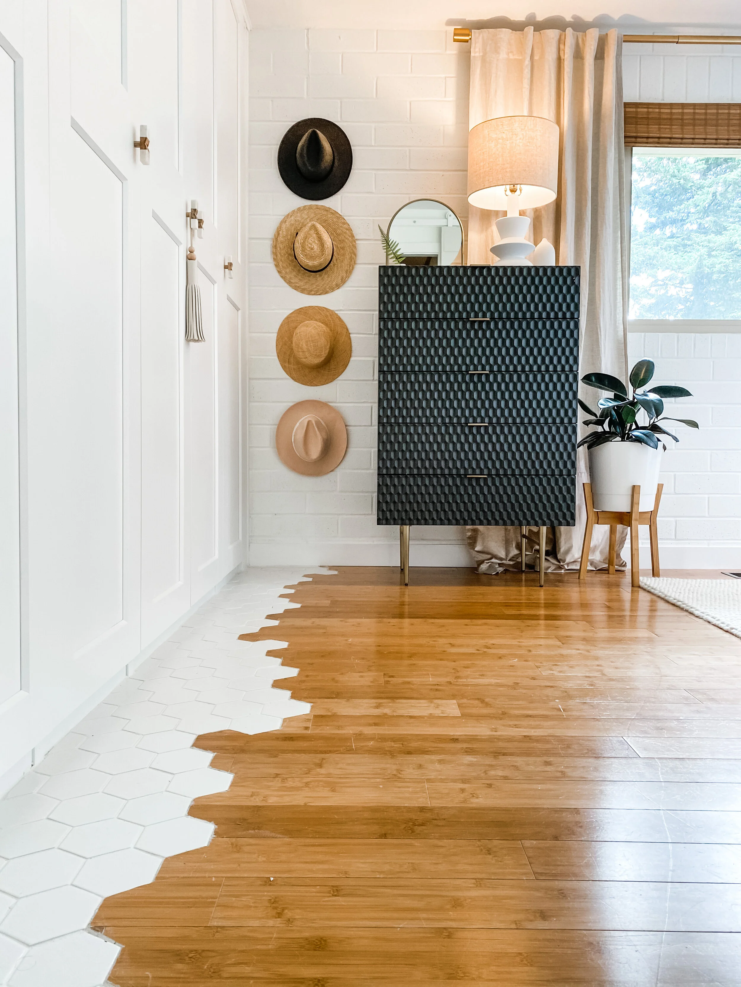 My pride enjoy of this entire project probably has to be tackling the tile work outside of the closet. It’s interesting because now that I’ve done it, I’ve thought about 10 other ways that I could have solved my flooring issue between the bedroom and the closet, but I’m really proud of myself for being brave and learning a new skill set. Now, every time I walk into the bedroom, I smile knowing how hard I had to work at making that transition look beautiful and loving every square inch of it.